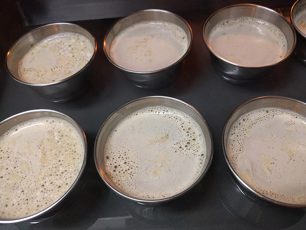 - Añadimos a la bandeja el agua caliente vigilando que no caiga en los flanes (el agua tiene que cubrir las flaneras una tercera parte).